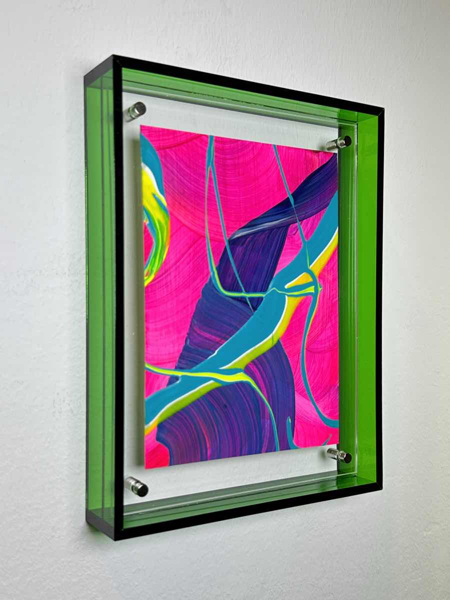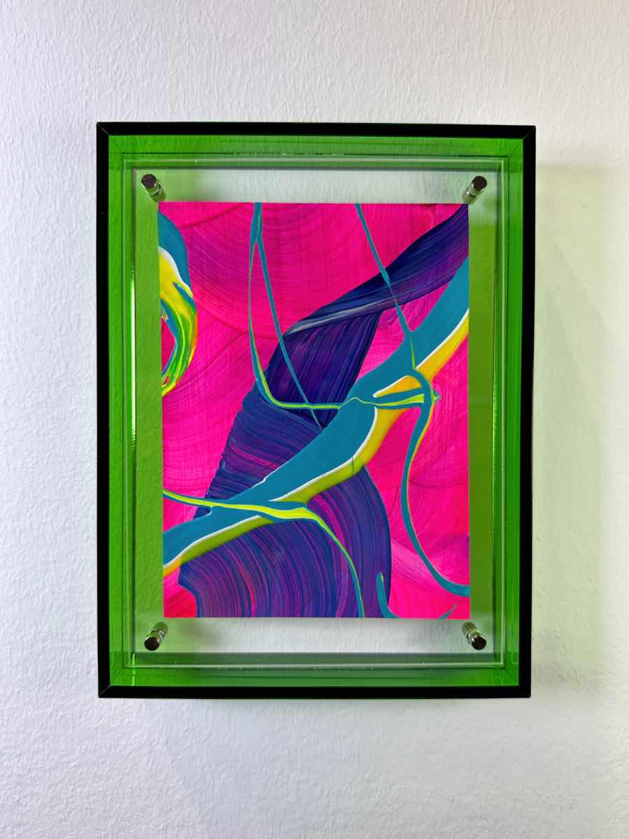Acryl auf Papier in grünem Acrylrahmen  pink / gelb