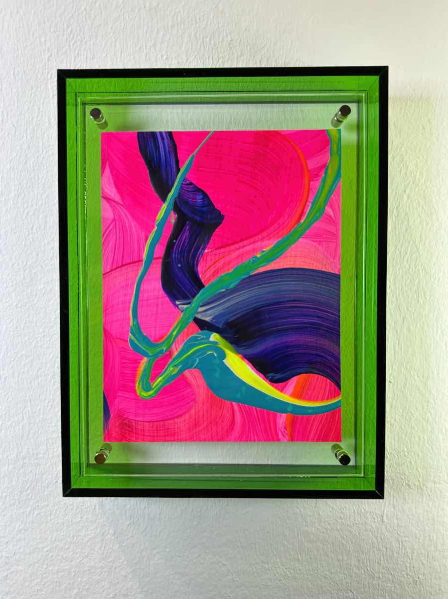Traumhafte Mini Kunst in leuchtenden Farben: „Easy Flow“ ein energetisierendes kleines Kunstwerk – abstrakte Form trifft auf leuchtende neon Farbe.  Dynamische, fliessende Bewegungen fügen sich zu einem energiegeladenen und fesselnden Blickfang. Der grüne Rahmen aus  Acrylglas unterstreicht  das intensive Farbspiel und lässt das Werk regelrecht an der Wand leuchten.