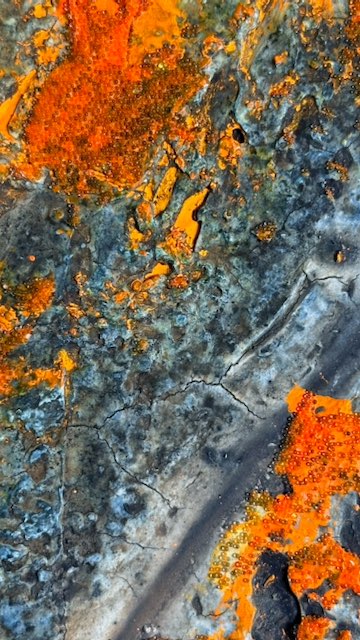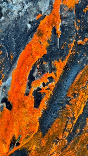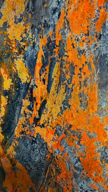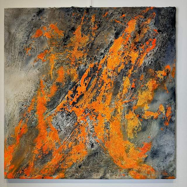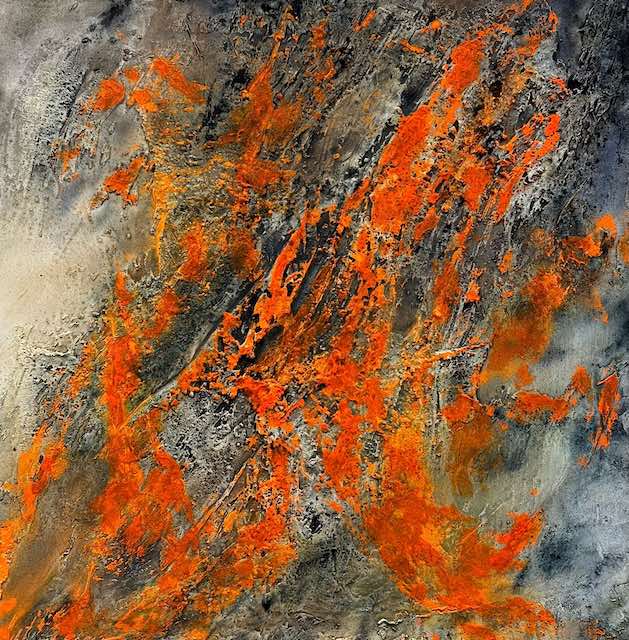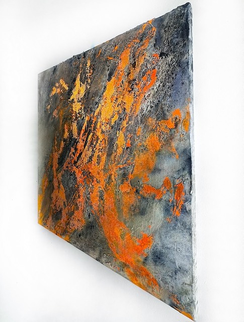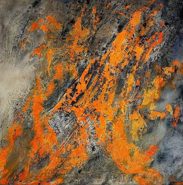 Feuer und Stein – zwei gegensätzliche Elemente, die in diesem Werk zu einer harmonischen Einheit verschmelzen. Die Technik der strukturierten Oberflächen und reflektierenden Materialien verstärkt den Kontrast: Während das leuchtende Feuer durch dynamische Farbaufträge in Schichten förmlich zu glühen scheint, wirkt der steinartige Untergrund durch feine Schattierungen und erhabene Strukturen massiv und beständig. Der Lichteinfall verändert die Wahrnehmung der reflektierenden Flächen, sodass das Bild je nach Betrachtungswinkel immer wieder neu erlebt werden kann. Diese Technik unterstreicht das Spannungsfeld zwischen Veränderung und Dauerhaftigkeit und lässt die Zeitlosigkeit von Feuer und Stein fühlbar werden – eine Quelle von Stärke und Ausdauer.