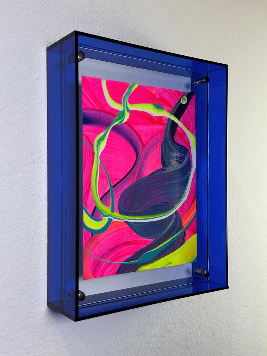 Acryl auf Papier in blauen Acrylrahmen  pink / gelb