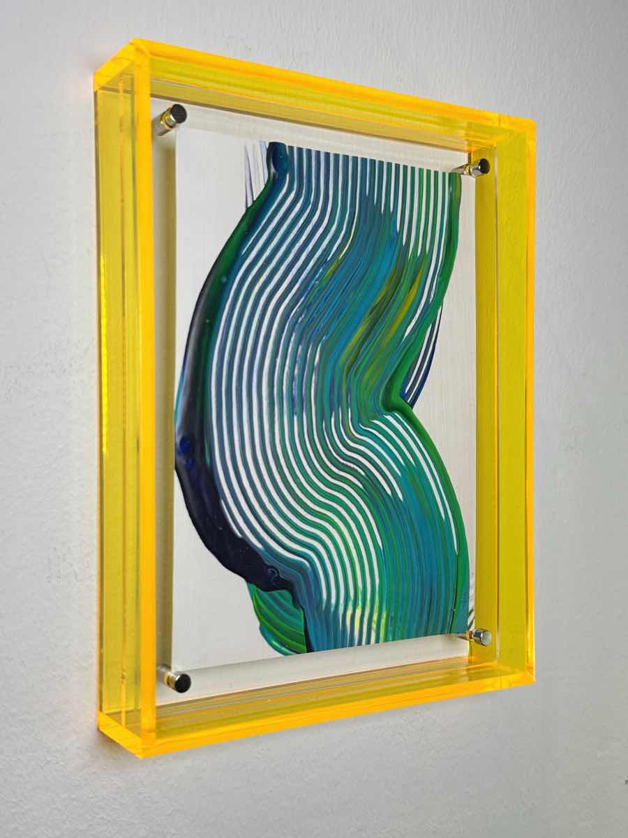 „Many Ways“ Traumhafte Mini Kunst blau grün und gelb mit leuchtendem Acrylrahmen in Gelb. Die fliessende Bewegung überträgt pure Energie an Ihre Wand – jetzt direkt online kaufen.