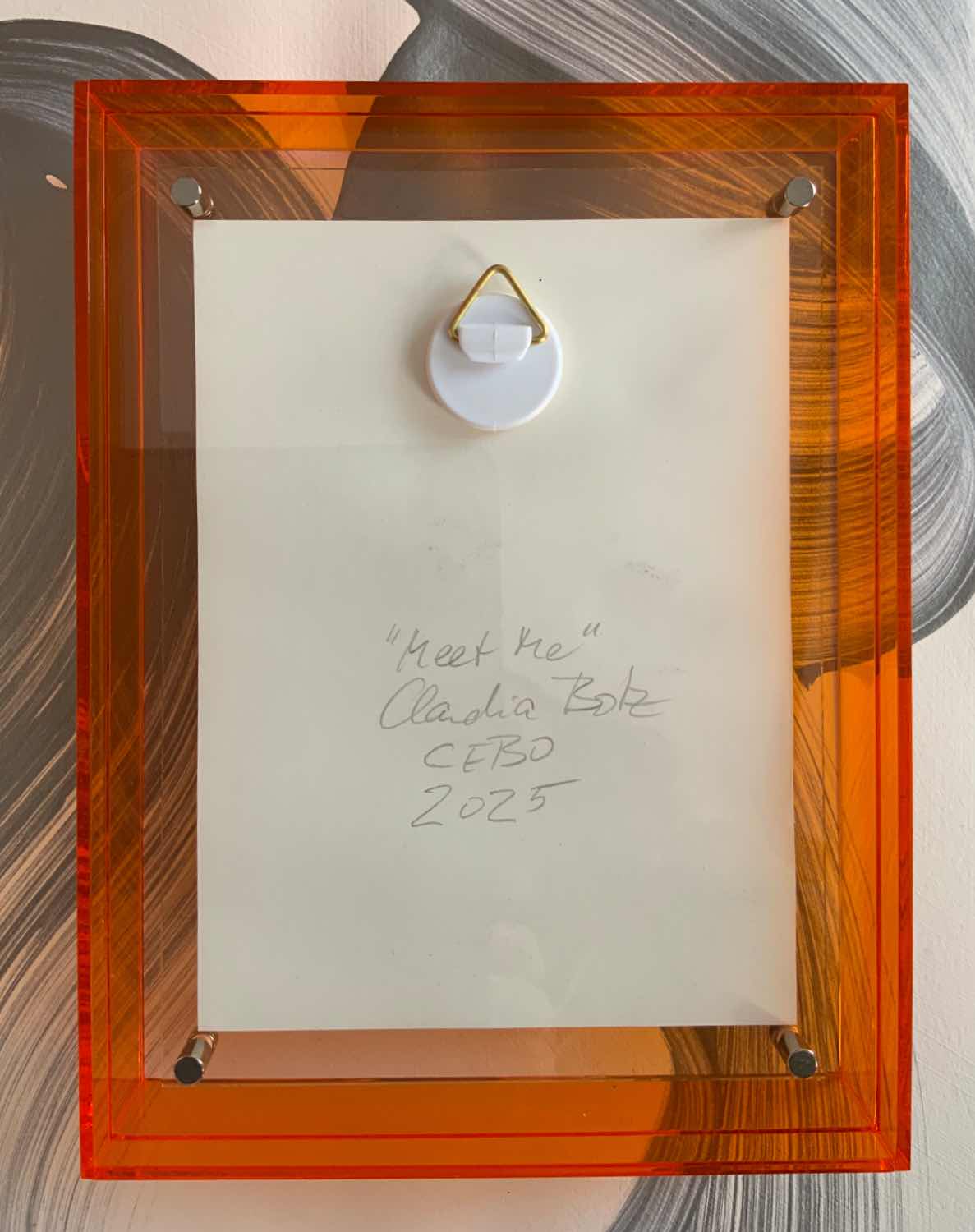 Drei orangefarbene Punkte – Minimalistische Kunst natur orange – auf einem sanft geschwungenen weißen Grund laden zur Begegnung ein. „Meet me“ ist reduziert, verspielt – und durch den orangefarbenen Acrylrahmen lebendig eingefasst.